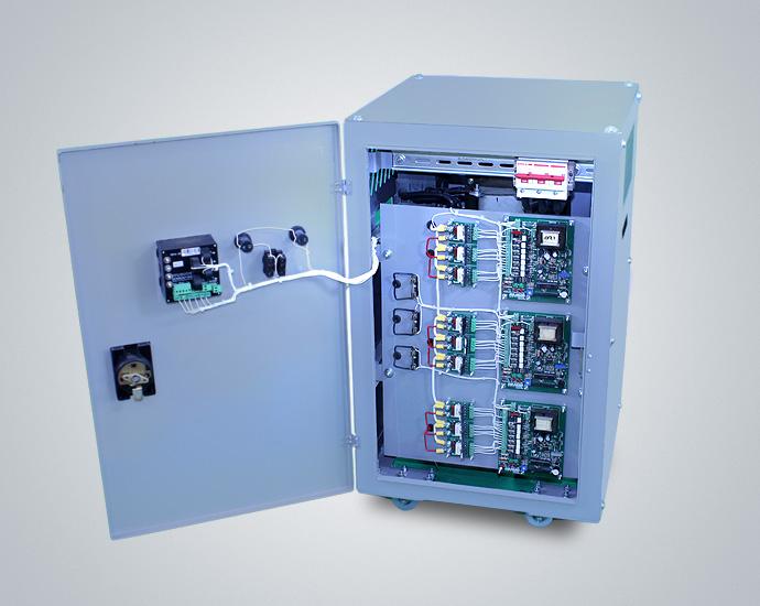 Regulador electrónico de voltaje bifásico de 24KVA, 240 con bypass, mantenimiento, retardo de encendido, analizador de red conexión a ethernet.